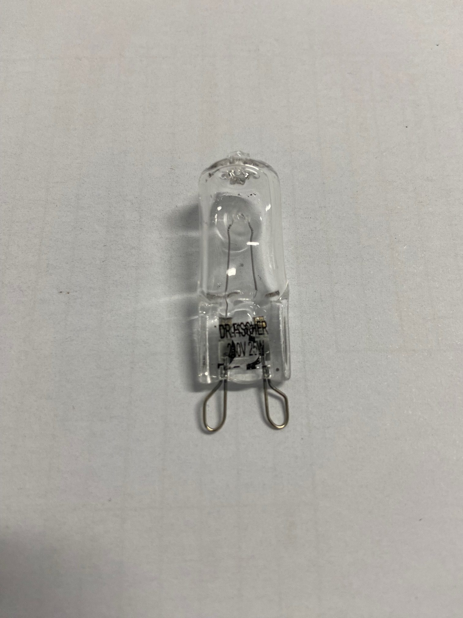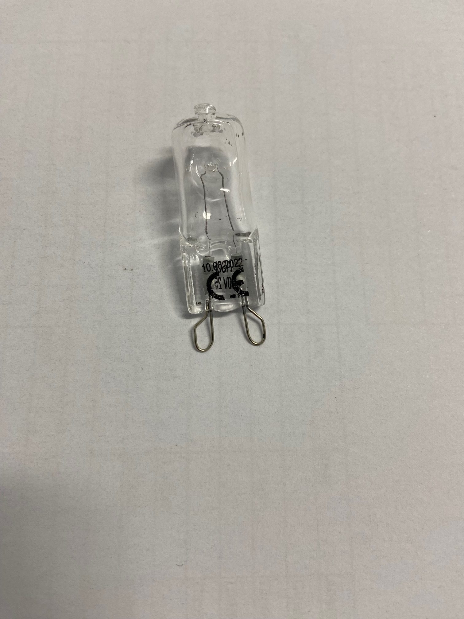 25Watt – 230VAC – 210 Lumen – Halogen lamp with G9 base. G9s feature two looped pins at the base spaced 9mm apart.
